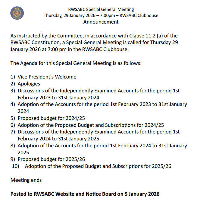 As instructed by the Committee, in accordance with Clause 11.2 (a) of the RWSABC Constitution, a Special General Meeting is called for Thursday 29 January 2026 at 7:00 pm in the RWSABC Clubhouse.